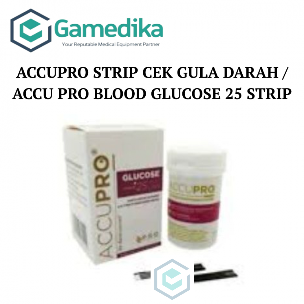 "Harap konfirmasi terlebih dahulu. ACCUPRO Strip Blood Glucose / Strip untuk Cek Kadar Gula Darah Kemasan botol berisi 25 Strip. Strip khusus ACCUPRO 4 in 1 dalam melakukan cek gula darah. PERHATIAN: 1. Terdapat Buku Panduan yang HARUS Anda baca dengan seksama sebelum menggunakan alat ACCUPRO, agar Anda dapat menggunakan alat ini dengan benar. 2. Setelah memasukkan Strip/Stick pada Alat AccuPro, SEGERA TEKAN tombol C pada Alat AccuPro untuk menyamakan/mencocokan nomor kode. (Lihat Buku Petunjuk untuk mengetahui letak tombol C). NOMOR IZIN EDAR :AKL 20101420948 "