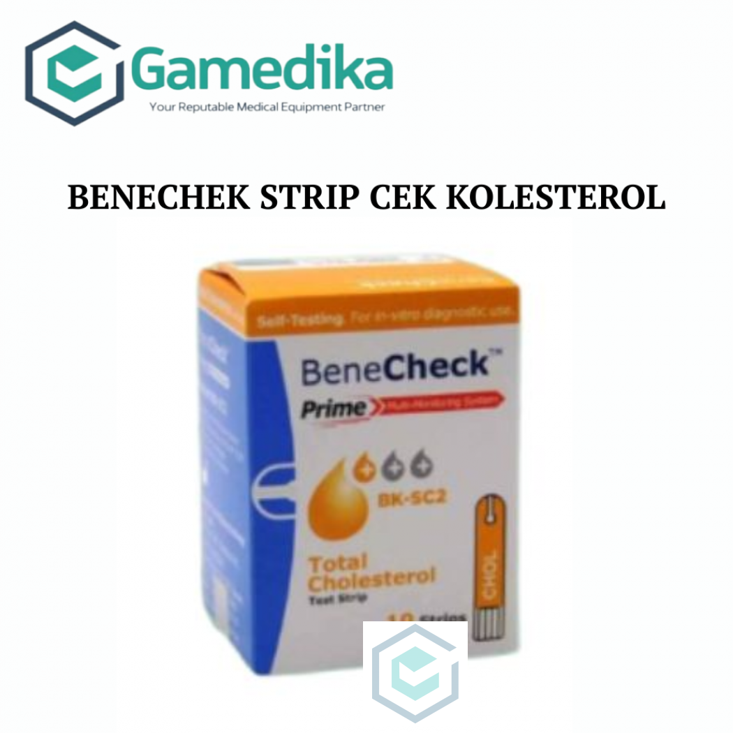 Harap konfirmasi terlebih dahulu BENECHEK STRIP CEK KOLESTEROL "BeneCheck PRIME Test Strip Cholesterol digunakan sebagai alat screening kesehatan (Khusus Kolesterol). Untuk pemeriksaan kesehatan menggunakan sampel darah kapiler dari jari. Pengambilan sampel darah menggunakan jarum sekali pakai (lancet) dan hasil pemeriksaan akan ditampilkan di layar dalam hitungan detik. Keunggulan : – Durasi : 26 Detik – Rentang : 100-400 mg/dL – Isi : 10 Strip KEMENKES RI AKL 20101913158