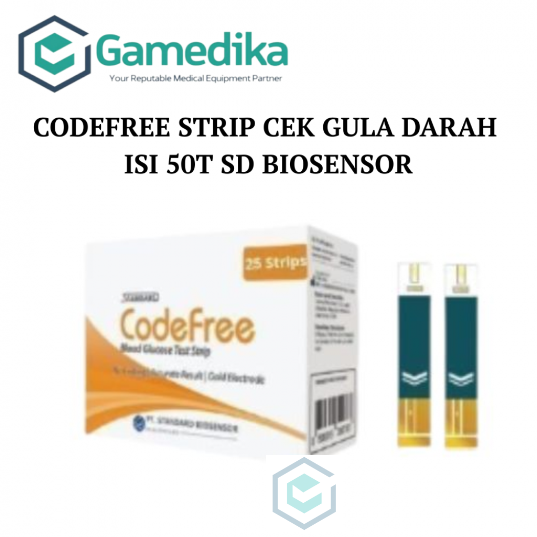 "Harap konfirmasi terlebih dahulu. Strip gula darah CodeFree merupakan test strip yang digunakan untuk melakukan pemeriksaan kadar gula dalam darah secara kuantitatif. Sampel yang digunakan ialah capillary whole blood dengan volume yang dibutuhkan 0,9 μL Nomor izin Edar: AKD 20101220831"