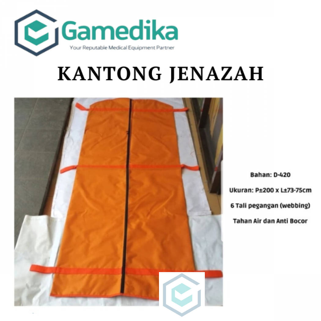 Harap konfirmasi terlebih dahulu. Kantong Jenazah / Kantong Mayat (Body Bag) ini sering digunakan untuk membungkus mayat sementara para korban kecelakaan yang sudah meninggal, untuk dipindahkan dari suatu kejadian ketempat yang lebih baik. Kantong untuk jenazah ini dilengkapi dengan resleting dan biasa dipakai oleh rumah sakit, patroli polisi, forensik, rumah duka, bencana alam, SAR, kantor, ambulans.