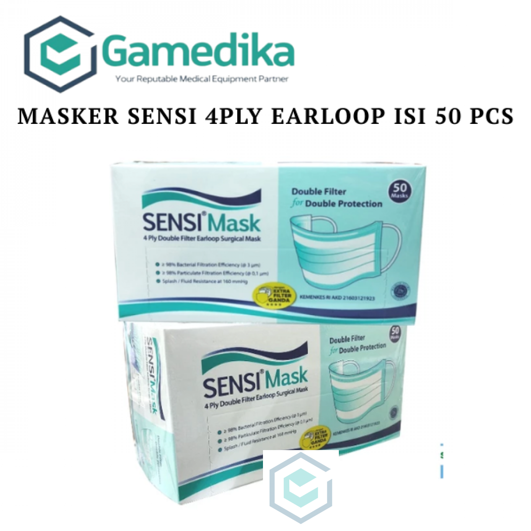 Harap konfirmasi terlebih dahulu. SENSI Masker Medis tipe pengait telinga berlapis 4 dengan lapisan filter ganda (Double Filter) yang berfungsi menyaring udara kotor dan menahan percikan cairan, mengurangi risiko penyebaran virus, kuman dan bakteri serta debu atau partikel mikro lainnya. Lapisan yang lembut, mudah bernapas, terbuat dari bahan bebas lateks dan fiberglass, penyepit tulang hidung lebih aman karena tidak memakai kawat logam. Isi: 50 pcs Model: Pengait Telinga (Earloop)