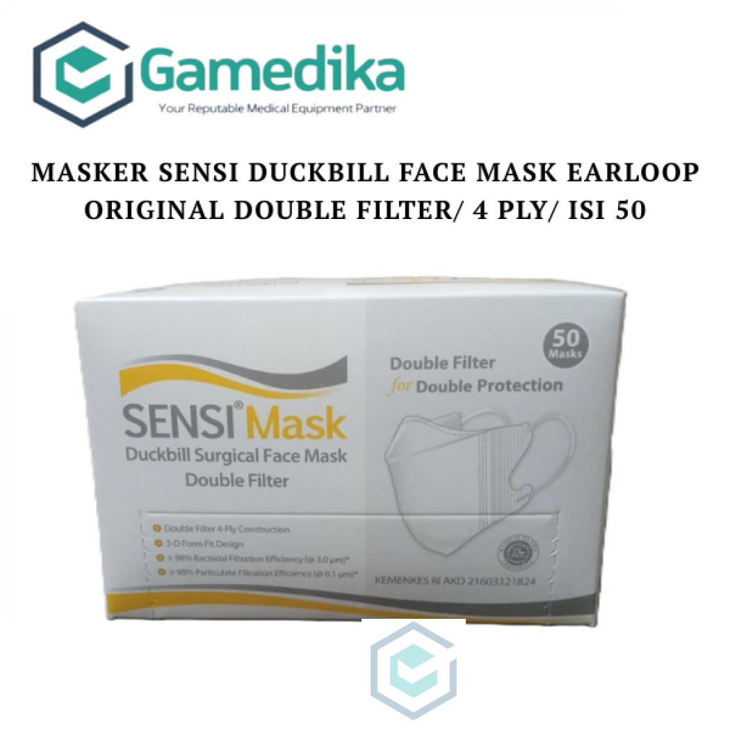 Harap konfirmasi terlebih dahulu. Sensi Duckbill Face Mask Isi 50 : - Masker bentuk Duckbill Face Mask - Dapat dikaitkan langsung di telinga - Hypoallergenic (Jarang menimbulkan alergi) - Dilengkapi dengan 4 lapis filter debu dan bakteri Sensi Mask Duckbill Face Mask merupakan masker pelindung wajah dengan model duckbill yang berfungsi untuk melindungi saluran pernapasan dari debu, asap, kuman, polusi, cairan, dan partikel mikro lainnya. Masker jenis ini memiliki design dan bentuk yang pas sehinga aman dan nyaman ketika digunakan. Penggunaan masker ini juga mampu menyaring sampai 98% partikel berukuran 0.3 milimicro. Fitur Produk : - Double Filter 4-Ply Construction - 3-D Form Fit Design - ≥ 98% Bacterial Filtration Efficiency (@3.0 μm) - ≥ 98% Particulate Filtration Efficiency (@0.1 μm) Cara Pakai : Tutup hidung dan mulut dengan masker dan pasangkan tali pengait masker pada telinga KEMENKES RI AKD 21603121824 Notes : Segera ganti masker bila kotor, basah atau rusak
