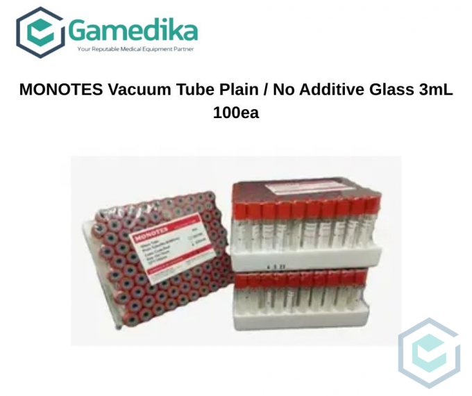 Harap konfirmasi terlebih dahulu "MONOTES Vacuum Tube Plain / No Additive Glass 3mL 100ea AKL 20101127266 Description: For serum in chemistry, immunology and serology 1 pack isi (100 pcs), 1 Karton isi 18 pack. Color Code : Red Size Tube : 13 x 75 mm. Volume Tube : 3 ml (glass)"