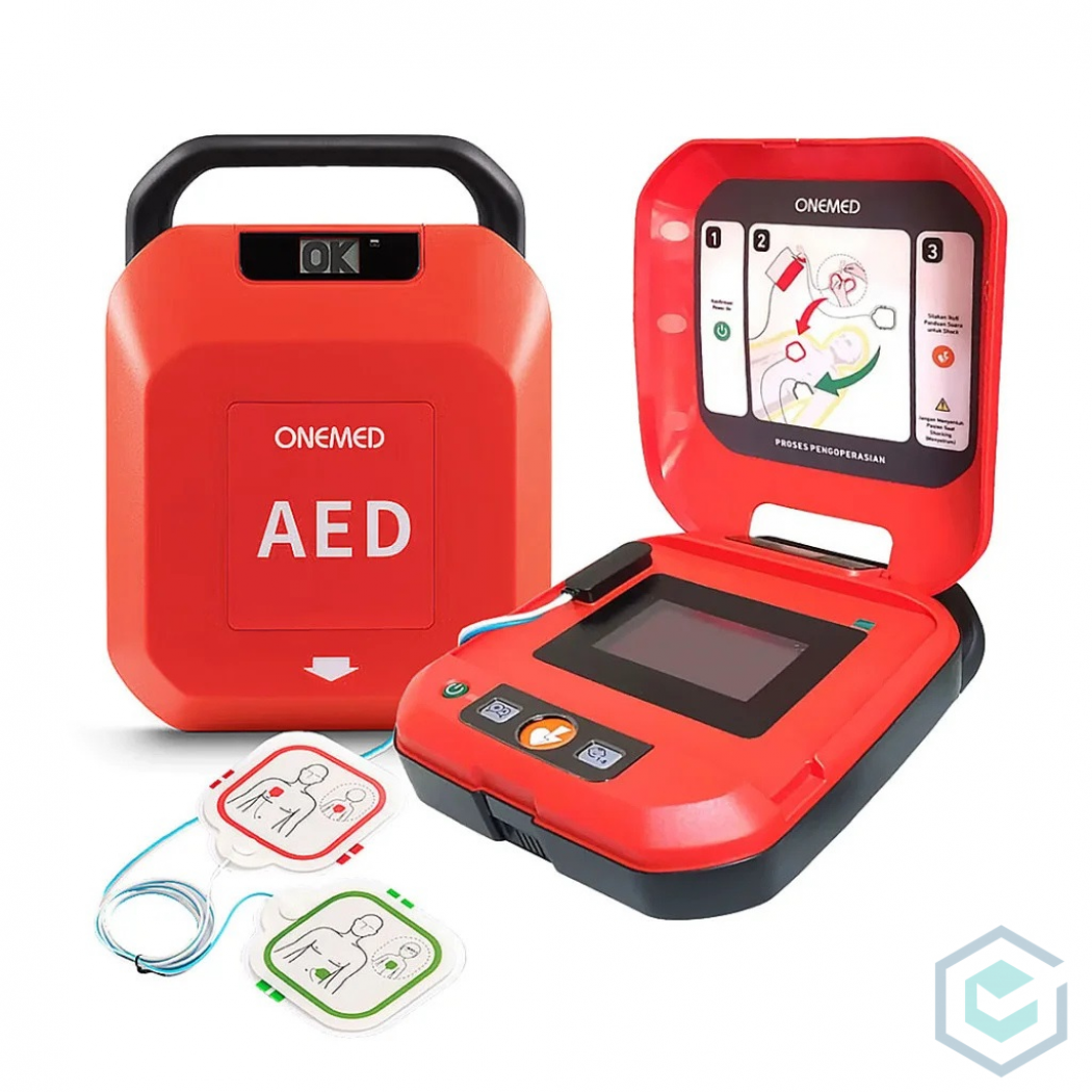 AED defibrillator (automatic external defibrillator) untuk menyelamatkan seseorang dari serangan jantung mendadak. AED dapat menyelamatkan nyawa seseorang dengan memberikan defibrilasi pada jantung. Studi menunjukkan bahwa defibrilasi dalam waktu tiga menit dari serangan jantung mendadak dapat meningkatkan kemungkinan bertahan hidup dari 5% menjadi lebih dari 70%. Onemed AED Defibrillator OneHeart A8 merupakan perlengkapan CPR yang dapat digunakan untuk memberikan kejut listrik ke jantung untuk mengembalikan ritme normalnya. Perangkat ini sangat portable berukuran kecil dan mudah digunakan, menggunakan teknologi Jerman sangat cepat dan efisien, berpacu dengan waktu dapat menyelamatkan nyawa seseorang dalam 4 menit. Fitur Produk Pengoperasian mudah digunakan Andal dan siap digunakan, kapan saja dan dimana saja Waktu pengoperasian yang singkat dengan sistem 3 langkah mudah (buka, pasang dan tekan) Dilengkapi dengan tombol sakelar, dengan peralihan satu tombol mode dewasa dan anak Dilengkapi dengan pengingat ganda dengan tombol kontrol suara dan kontrol lampu, pengoperasian menjadi lebih aman Mendukung mode multiple compression dari 30:2 dan 15:2 Dilengkapi panduan suara siklus untuk CPR Dilengkapi lembar elektroda yang cerdas, memberikan laporan inspeksi diri dengan akurat Dilengkapi dengan baterai dengan daya tahan baterai 6 tahun Penyimpanan internal data misi, ekspor melalui USB Beratnya hanya sekitar 2,5 kg Spesifikasi Produk Data storage: ECG wave, CPR data: 10h, audio log: 2h, event log: 2000, self-test report:2650 Data transfer: 2.0 Button: power, shock, child, language Pad type: disposable defibrillation electrodes for adult and pediatric, default without CPR feedback sensor Energy output: for adult: 200J/300J/360J, for children: 50J/70J/100J Shock frequency: 75 times 360 discharge Battery: LiMn02, 24V, 1.2Ah, non re-chargeable Shelf life: 10 years Dimension: 22x9.7x29.6cm Weight : approx. 2.5kg