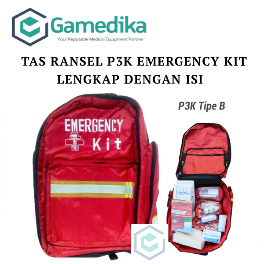 HARAP KONFIRMASI TERLEBIH DAHULU. Tas Emergency Kit untuk pertolongan pertama pada kecelakaan, didalam tas ini terdapat seperti kotak2 kecil, berfungsi untuk menyimpan peralatan atau perlengkapan P3K supaya tidak berantakan. Dibuat dari bahan yang berkualitas membuat tas ini kuat dan tahan lama. 1. Kasa Steril Terbungkus = 40, 2. Perban (lebar 5cm) = 4, 3. Perban (lebar 10cm) = 4, 4. Plester (lebar 1,25cm) = 4, 5. Plester Cepat = 15, 6. Kapas (25gram) = 2, 7. Kain Segitiga/mitella = 4, 8. Gunting Perban = 1, 9. Peniti = 12, 10. Sarung Tangan Sekali Pakai (pasangan) = 3, 11. Masker = 4, 12. Pinset = 1, 13. Lampu Senter = 1, 14. Gelas Untuk Cuci Mata = 1, 15. Kantong Plastik Bersih = 2, 16. Aquades 100 ml lar.Saline (diganti dengan Yrins 12 ml) = 1, 17. Povidon Iodin (60ml) = 1, 18. Alkohol 70% = 1, 19. Buku Panduan P3K ditempat Kerja = 1, 20. Buku Catatan = 1, 21. Daftar Isi Kotak = 1.