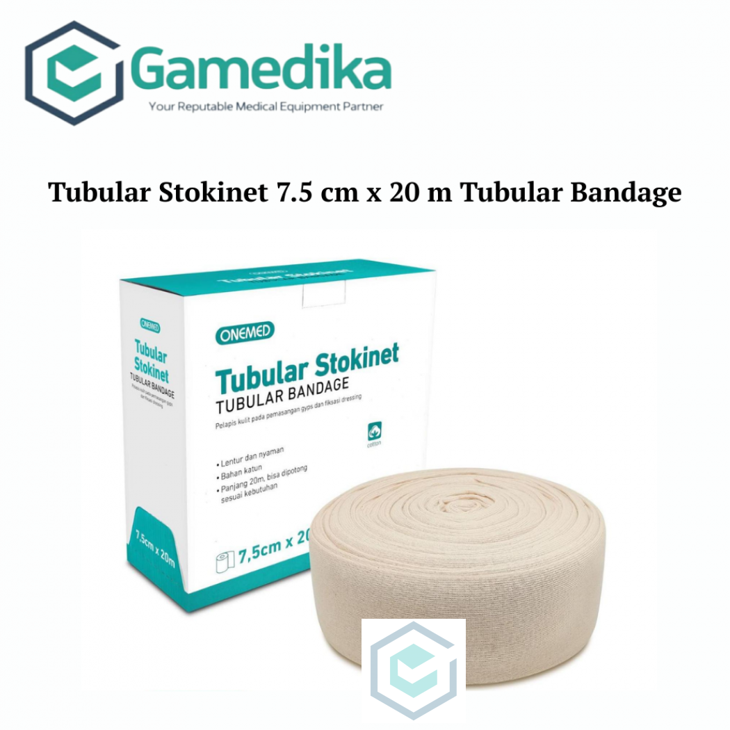 Harap konfirmasi terlebih dahulu. Tubular Stokinet 7.5 cm x 20 m Tubular Bandage Onemed Pelapis kulit pada pemasangan gyps dan fiksasi dressing - Lentur dan nyaman - Bahan katun - Panjang 20 M, bisa dipotong sesuai kebutuhan Satuan : box isi 1 pcs KEMENKER RI AKD 10902322659
